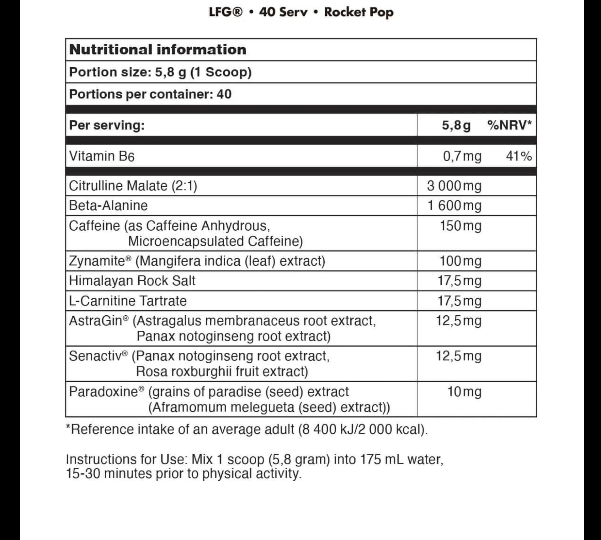 Suggested Use: Mix 1 scoop (5.8g) into 175ml of water 15–30 minutes prior to physical activity.